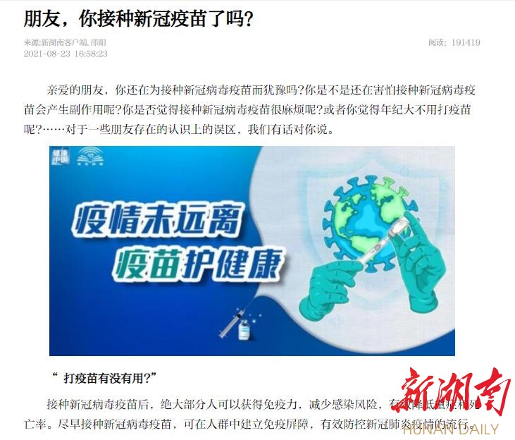 该市在“邵阳机关党建”微信公众号等平台,推送《关于全速推进党员干部接种新冠病毒疫苗的倡议书》等文章,倡议全市党政机关、企事业单位各级党组织及广大党员干部争做“主动接种”的带头人、争做“应种尽种”的推动者、争做“全民接种”的引领员,其中《朋友,你接种新冠疫苗了吗?》对不愿接种群体的5个主要方面的困惑进行了解释,该文被“新湖南”App等平台转载,累计阅读量20多万次,提高了知晓率,营造了好氛围。