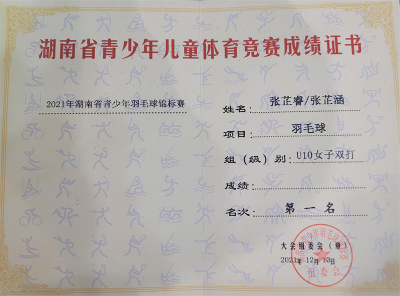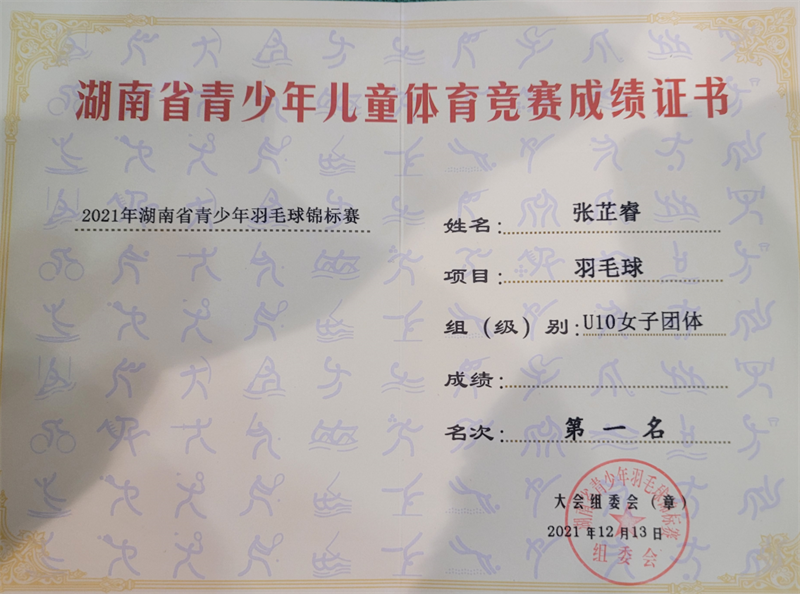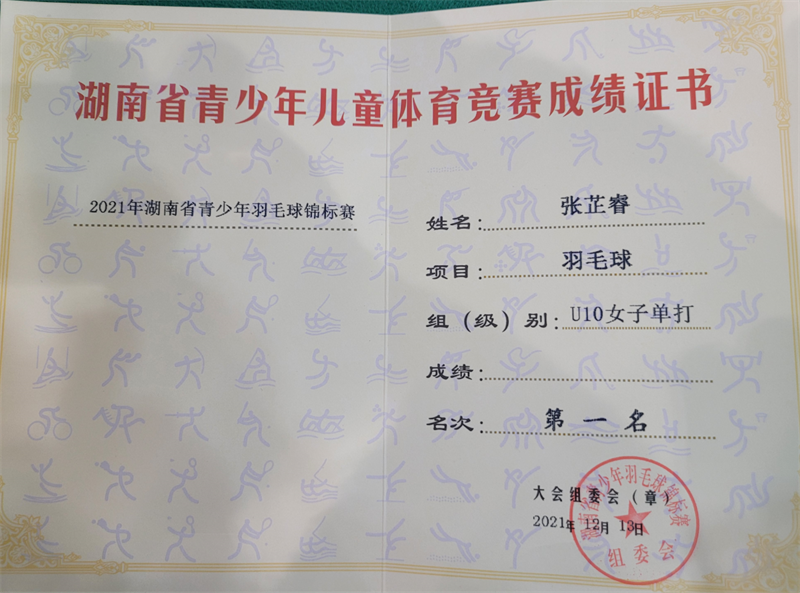 (通讯员 唐群姣 李琴 阮玲娟) 在刚闭幕的湖南省青少年羽毛球锦标赛上,滑石小学参赛队员获得喜人成绩,其中该校张芷睿同学获得女子U10单打冠军,与 张芷涵组合获得 U10 双打冠军,同时和其他队友一起获得 U10 团体冠军。另外该校何璟同学获得单打亚军和双打冠军;郑舜方同学获得男子团体冠军。