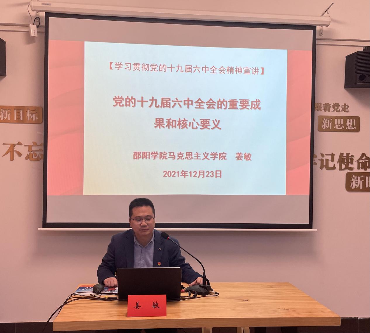 市青年讲师团成员,邵阳学院马克思主义学院讲师姜敏为大家做题为《党的十九届六中全会的重要成果和核心要义》的主题宣讲。深刻阐释了十九届六中全会的重大意义、重要成果、核心要义,积极引导新时代的中国青年要以实现中华民族伟大复兴为己任,增强做中国人的志气、骨气、底气,不负时代,不负韶华,不负党和人民的殷切期望。