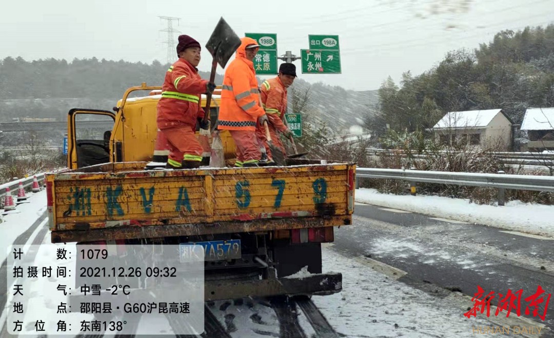 市交通执法支队高速路政大队在沪昆高速邵阳县路段开展融雪作业。