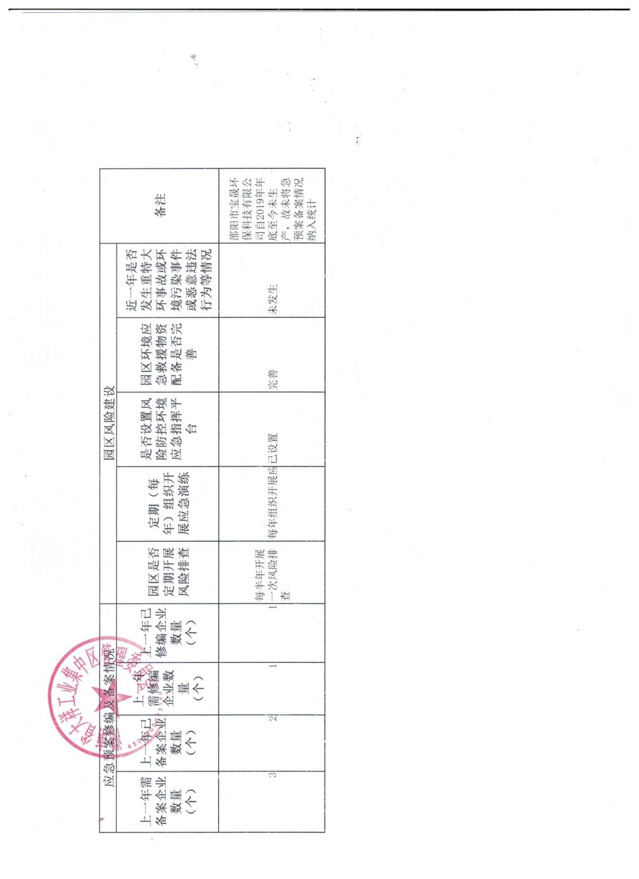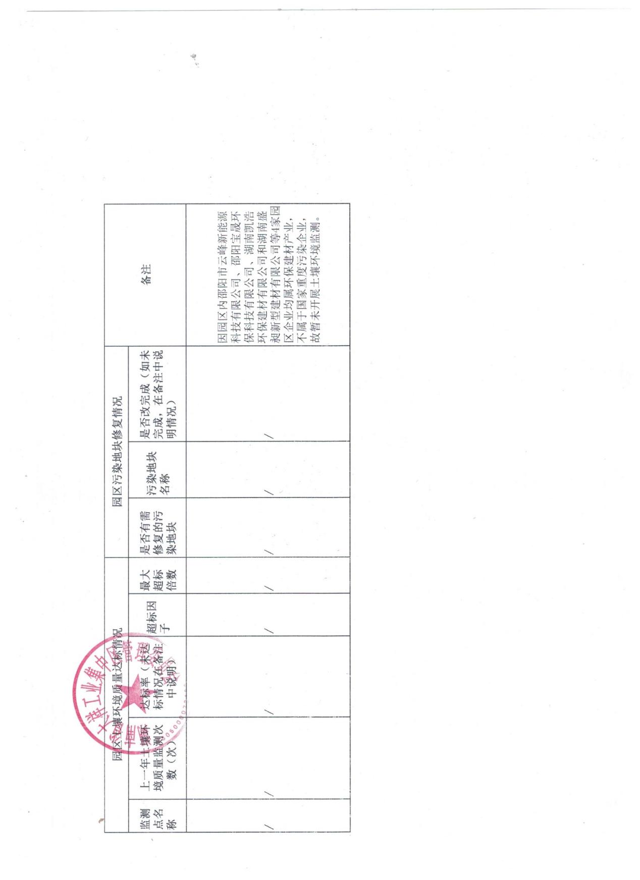 因园区内邵阳市云峰新能源科技有限公司、邵阳宝晟环保科技有限公司、湖南凯浩环保建材有限公司和湖南盛昶新型建材有限公司等4家园区企业均属环保建材产业,不属于国家重度污染企业,故暂未开展土壤环境监测。