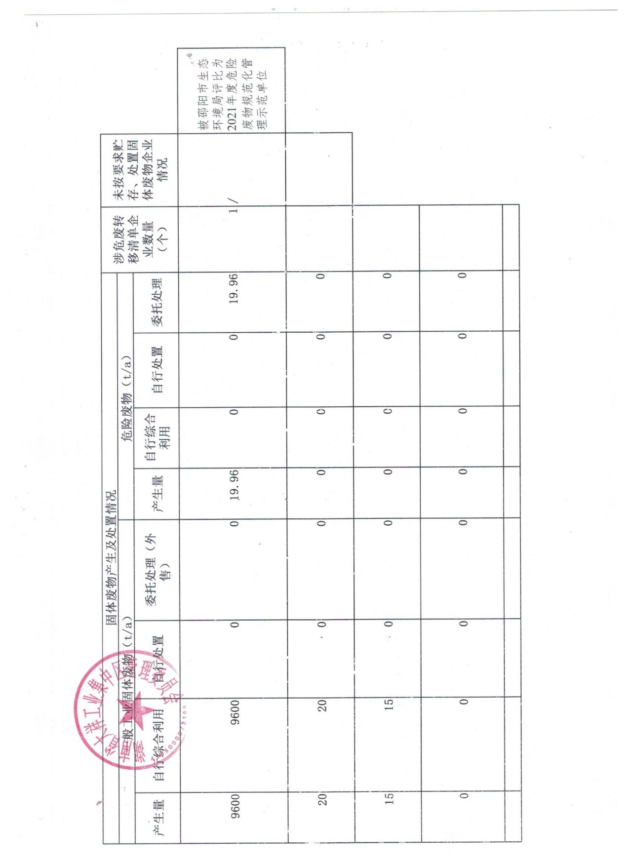 园区一般工业固体废物产生企业数量3个,产生量9635t/a,其中,自行综合利用9635t/a,自行处置0t/a,外委处置0t/a。危险废物产生企业数量1个,产生量19.96t/a,其中,自行综合利用0t/a,自行处置0t/a,外委处置19.96t/a。