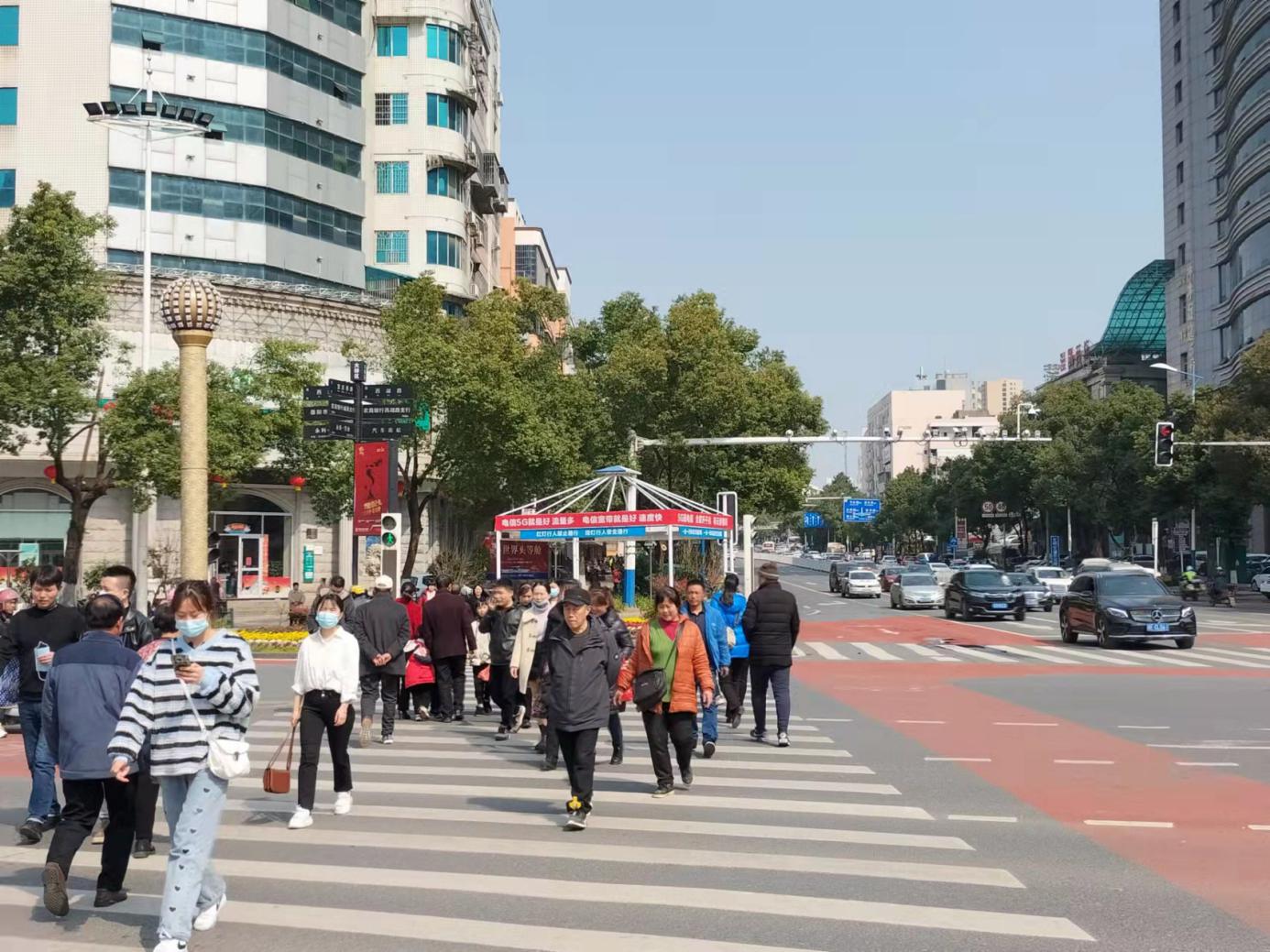 ▲南门口十字路口行人按照交通指示灯有序过马路。