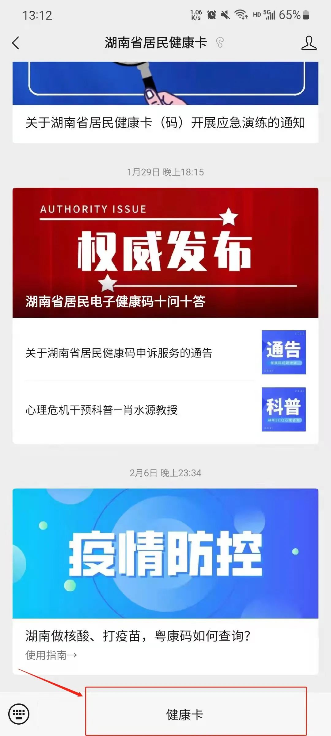 “场所码”申领入口:使用微信打开“湖南省居民健康卡”公众号,点击“健康卡”(图一)进入健康卡首页后点击“便民服务——场所码”(图二)。