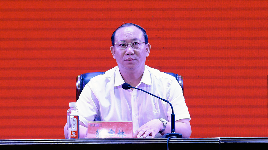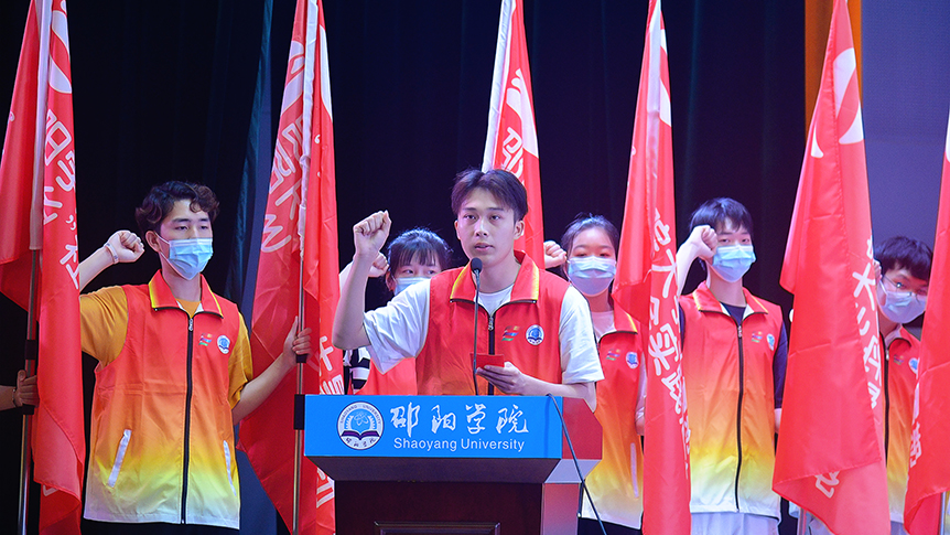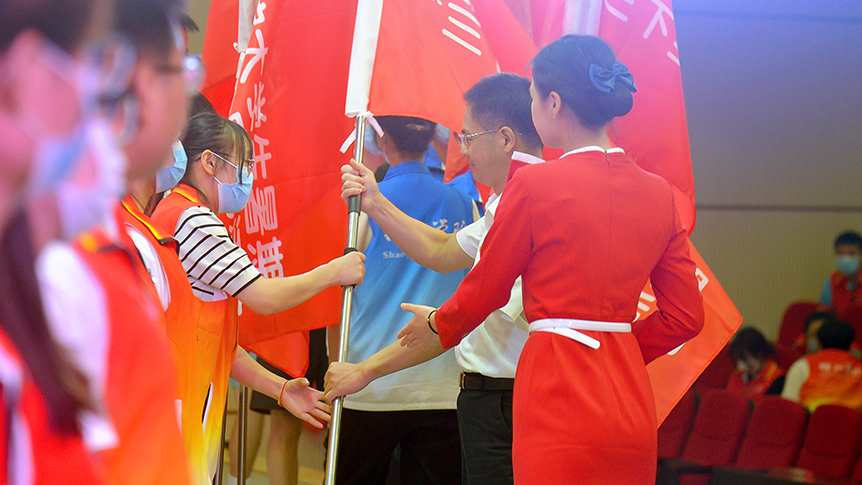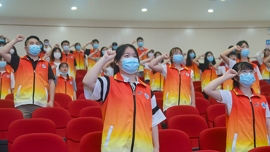 党委副书记、校长张平为2022年“三下乡”志愿服务团队进行授旗。全体与会团队成员庄严宣誓,随后齐唱中国共青团团歌。