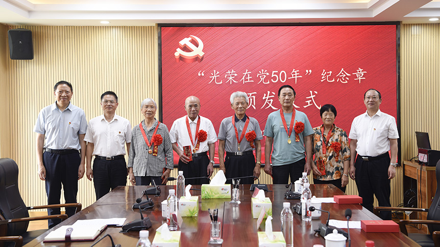 仪式庄重而热烈,彭希林为5名 “光荣在党50年”代表佩戴纪念章,将整个仪式推向高潮。