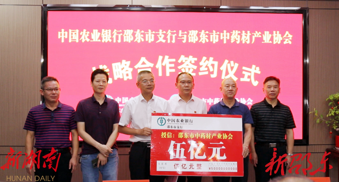 新邵东客户端7月4日讯(记者肖帅男)7月1日下午,中国农业银行邵东市支行与邵东中药材产业协会举行战略合作签约仪式,授信邵东市中药材产业协会5亿元的意向综合融资额度。邵东市政协党组书记、主席、市中医药产业链链长罗健康出席签约仪式并讲话,市政府二级调研员、中医药产业链副链长闵国伟主持签约仪式。