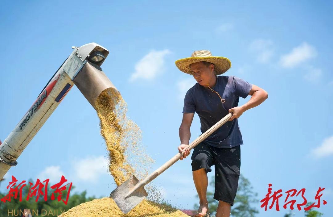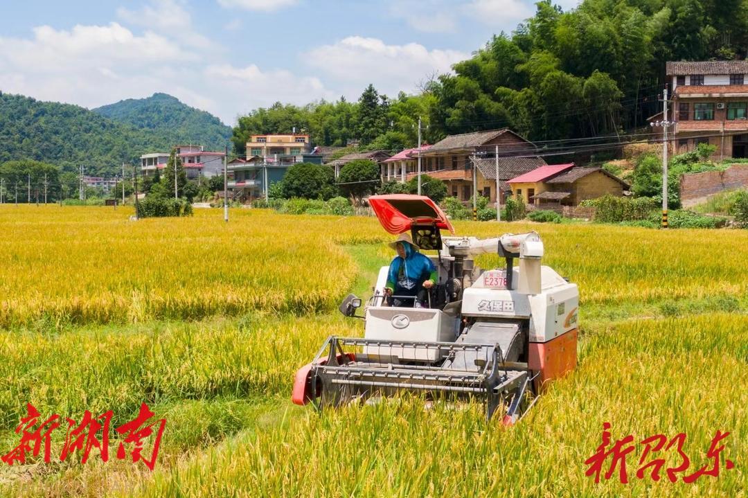 新邵东客户端7月14日讯(记者 邓远 通讯员 赵宇峰 邓祎可刘海实习生 陈可心)盛夏时节,正值早稻成熟收割之际。7月13日上午,记者在野鸡坪镇梅田村看到一块块金色飘香的稻田里,沉甸甸的稻穗随风起伏,稻香四溢。伴随着“隆隆”响声,一台台收割机在金黄的稻田里来回穿梭,一茬茬水稻源源不断地被卷入收割机,经过脱粒处理后的稻谷全部收拢在收割机的“肚”里,秸秆进行粉碎处理,从收割机尾部吹散到稻田里,10分钟左右的时间便完成了一亩稻田的收割。