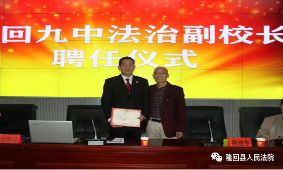 课前,隆回九中校长隆建华向唐保良颁发法治副校长聘书。