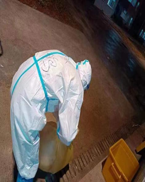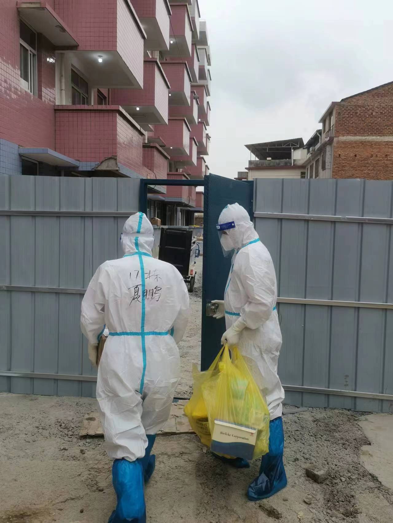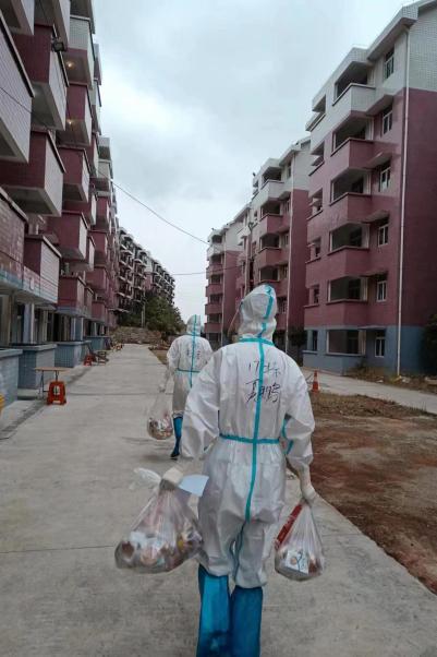 自此,每天进出隔离区,给他们送餐、收拾垃圾、送生活必需品等便成了他们的日常工作。每次换下的防护服,整个人就像从水里捞出一样。25号晚上11点多,住在隔离区2单元102室的一名2岁多的小孩儿突然高烧,急需退烧药。刚洗漱完毕的他又迅速穿上隔离服,冲进管控区送药,之后多次和小孩父亲电话了解情况,直到小孩父亲说稳定了才休息。