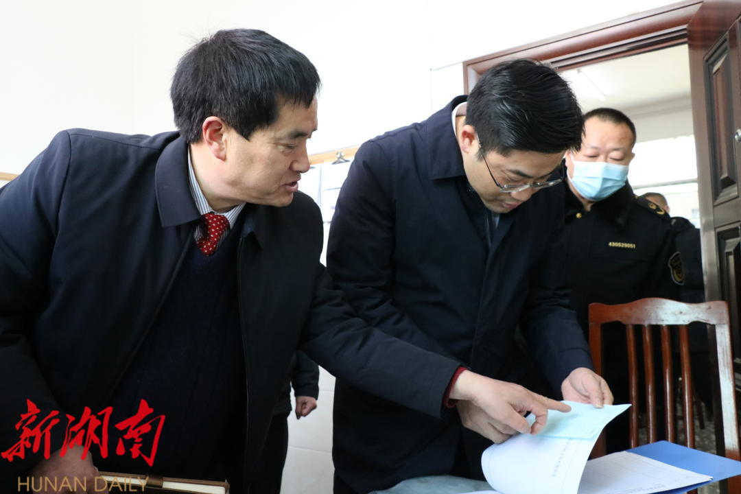 图为县委书记余勋伟在红旗小学本部校区查看分餐管理登记表