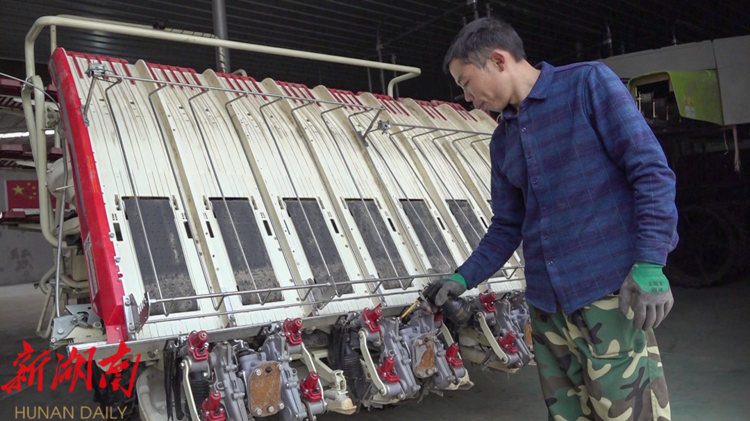 在新宁县丰旺家庭农场,机声隆隆,李晓明和父亲李承跃正在对农机设备进行检查、修整和调试。另一边,农户们正选用菜园土,加入水稻专用肥,采用机械化手段进行碎土、过筛,并放入秧盘中。丰旺家庭农场是一个家庭式农场,现有一整套的水稻生产全程机械化设备,独立温室育苗棚,烘干设备,实现全程机械化作业。该农场积极带头响应政府倡议,带动周边群众积极种植双季稻,有效阻止了耕地抛荒,并解决部分劳动力就业。