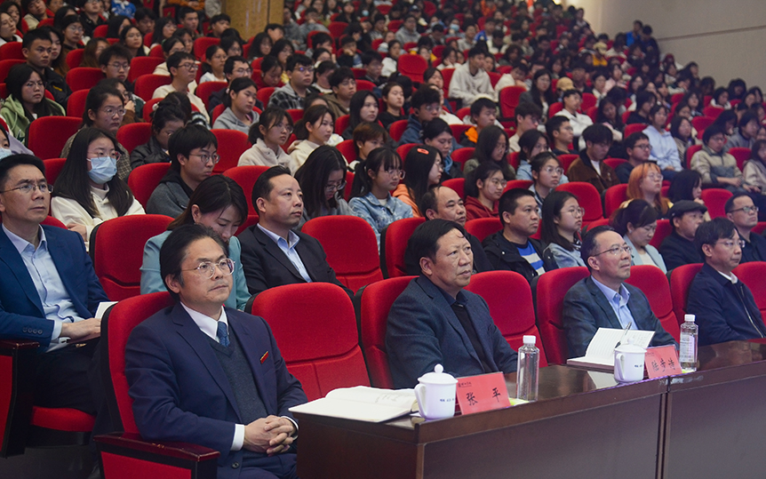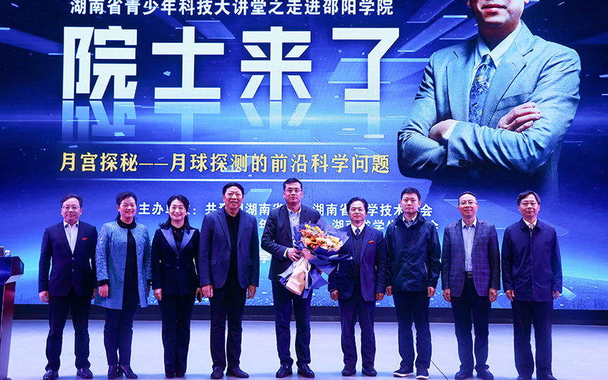 此次公益讲座是“‘院士来了’湖南青少年科技大讲堂暨首届湖南科技创新论坛”中的“院士专家邵阳行”系列活动之一,由团省委、省科协、省青联、省学联主办,邵阳学院承办、邵阳市科协协办,活动旨在深化实施青少年科技创新攀登行动,引领广大青年学生弘扬爱国精神和科学家精神,积极投身科技创新,以科创行动报效祖国。团省委学校部副部长廖成伟、市科协党组书记姚鹏飞及邵阳学院党委副书记、校长张平,党委副书记陆步诗,党委委员、副校长向文江,党委委员、副校长赵敏丽,党委委员、纪委书记李学勇,党委委员、副校长蒋剑平等全体在校校领导共同出席,党政办、团委、宣传部、教务处、科技处、学生工作部、研究生工作部、国内合作与校友工作办公室等相关职能负责人、各二级学院负责人、学生代表千余人倾听讲座。邵阳学院党委副书记、校长张平在总结讲话中指出,王赤院士从北京飞回家乡,为广大师生带来了科学盛宴,报告由浅入深,通俗易懂,精彩纷呈,为我们揭开了月球的神秘面纱,诠释了我们对宇宙星空的幻想与期待,同时也展示了王赤院士“感恩、责任、珍惜”的崇高追求。