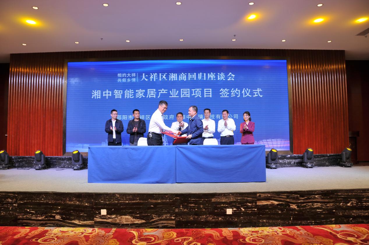 会议期间,王俊向部分企业家代表们颁发大祥区第一批招商大使证书,并与曾峤林、蔡治军、李江晖、吴方定等区领导向部分企业代表们颁发“邵阳市大祥区湘商回归联络服务站”工作牌,同时,大祥区委副书记、区长曾峤林成功签约智能家居产业园和湘中防火门生产基地两个项目。