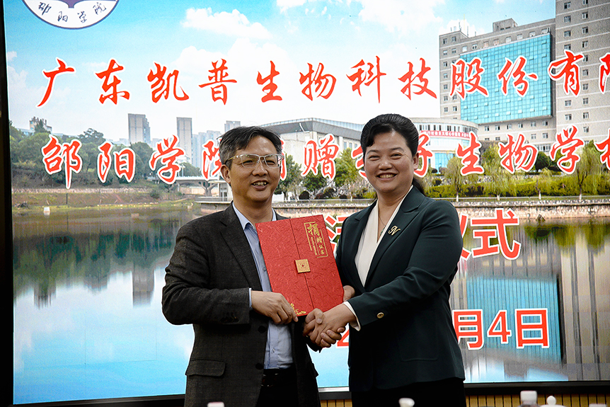 4月4日下午,广东凯普生物科技股份有限公司向学校捐赠分子生物学检测设备仪式在七里坪校区一办公楼318会议室举行。校党委委员、副校长赵敏丽出席捐赠仪式。参加捐赠仪式的有该公司凯普学院院长赵松元一行三人,邵阳学院普爱医学院、国内合作与校友工作办公室、资产与实验室管理处、医学技术学院等部门主要负责人。捐赠仪式由医学技术学院党总支书记钟方为主持。
