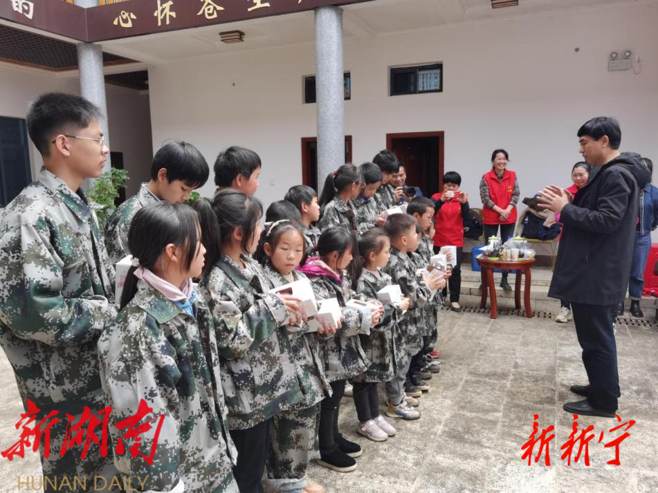 湖南省全民国防教育裕锋基地创办人——邵阳市政协委员、东莞新宁商会会长、县工商联副主席、新宁大邵公益会员肖剑锋,他不仅免费提供中餐和场地,还给每个孩子发放了200元慰问金、水杯和法制、国防教育读本,亲切嘱咐孩子们要努力学习,长大以后成为对社会有用的人。