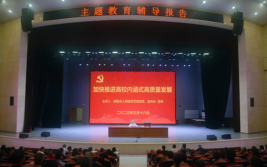 5月16日上午,邵阳市副市长蒋伟莅临我校,在七里坪校区逸夫图书信息楼报告厅做了一场题为《加快推进高校内涵式高质量发展》的主题教育辅导报告。他在报告中表示,希望邵阳学院坚定不移走内涵式高质量发展之路,当好邵阳创新发展的“领头雁”,邵阳市委、市政府将一如既往地支持学校发展建设,全力以赴推动学院成为一所特色鲜明的高水平应用型综合大学。