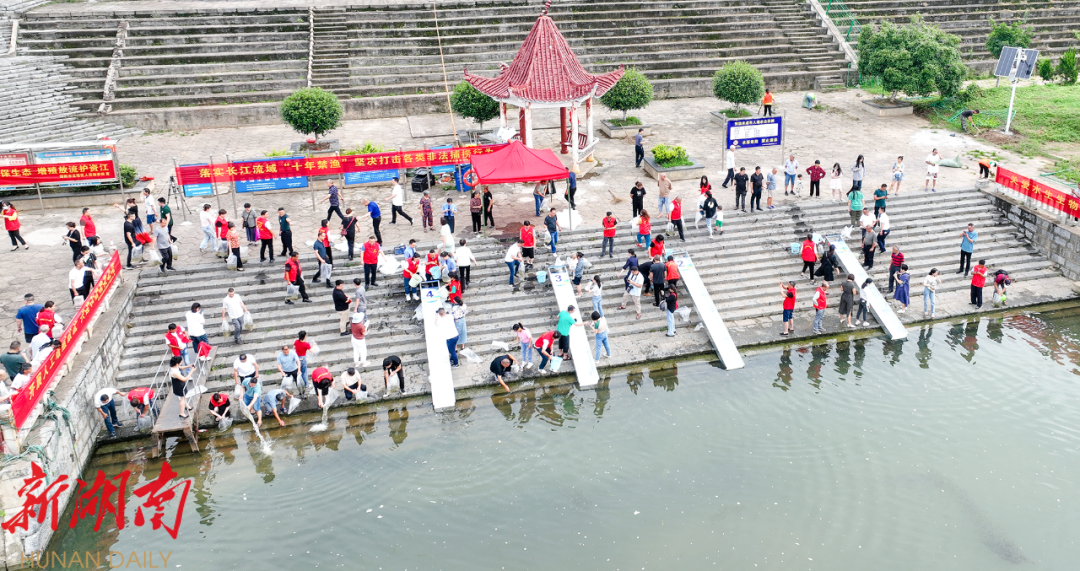 在活动现场,随着“扑通扑通”的入水声,参与放流活动的人员分批依序将青鱼20万尾、草鱼50万尾、鳙鱼400万尾、黄尾鲴30万尾,共计500万尾投放到资江河中。