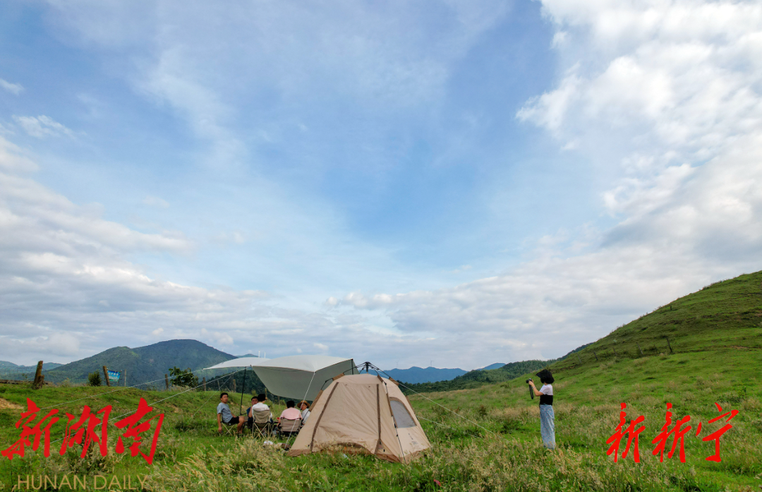 炎炎夏季,平均海拔1200米、日平均气温24°左右的新宁县黄金牧场却是蓝天白云、芳草依依、清爽怡人,成为避暑休闲胜地,游客们一边欣赏草山独特的风光,一边享受着阵阵吹拂的无限清凉,美丽风景令人心旷神怡,流连忘返。