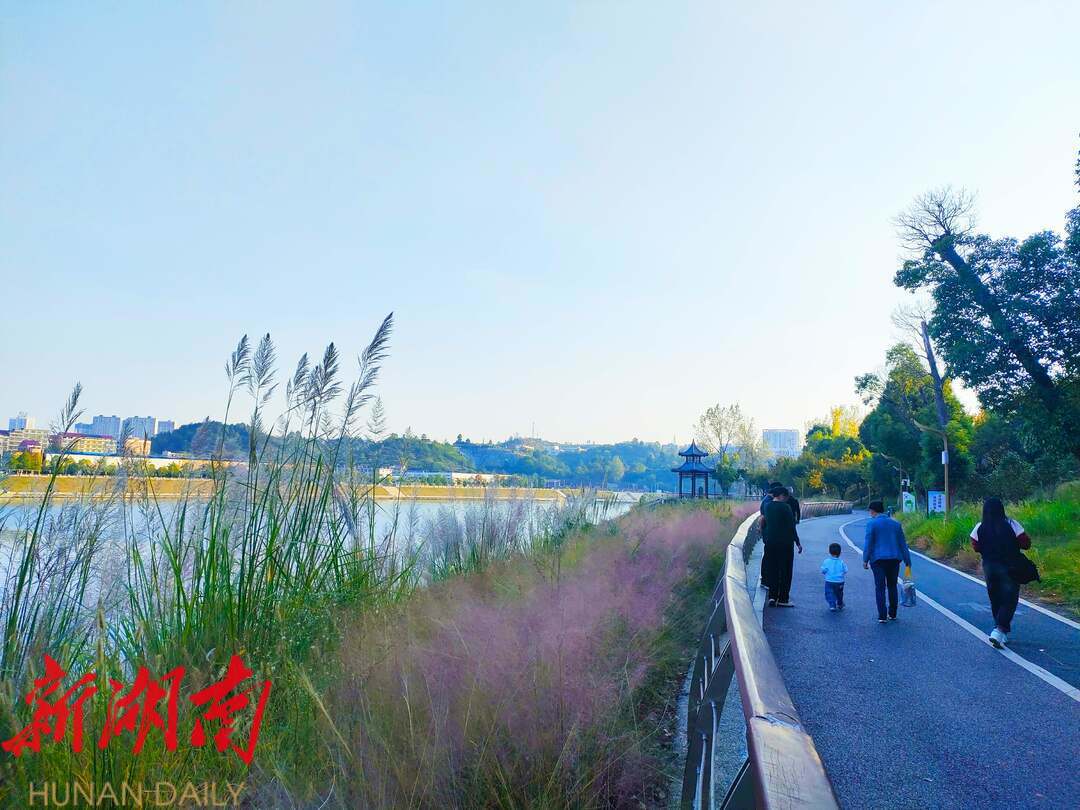 粉黛乱子草环绕的风光带上,休闲观光的游客络绎不绝。