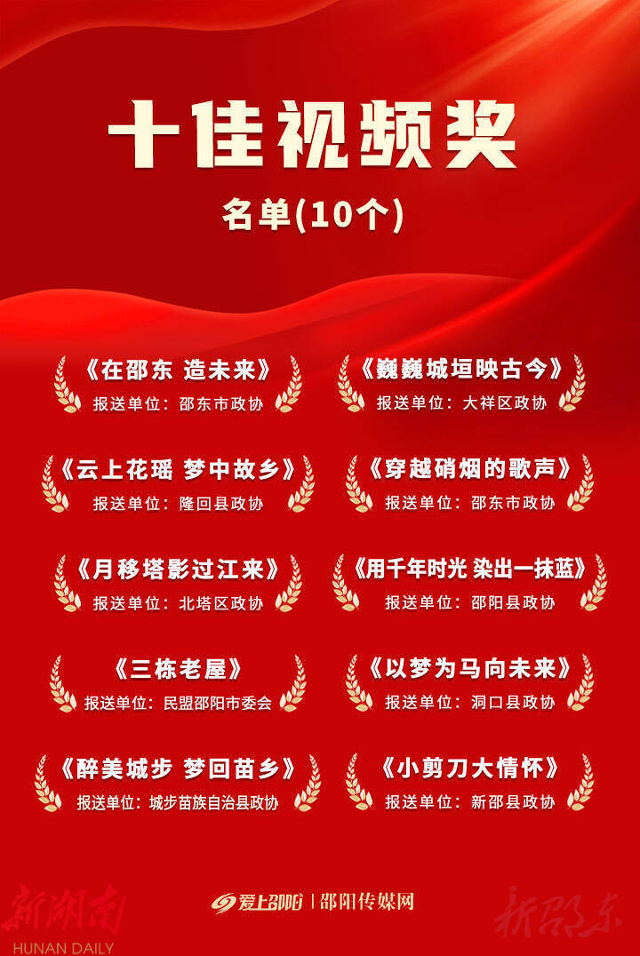 新邵东客户端12月20日讯(通讯员 刘昭云)12月19日,2023年度邵阳市“委员说邵阳”短视频大赛比赛结果揭晓,共有二十件作品获奖,其中,由邵东市政协报送的4件作品均获奖,荣膺比赛“大满贯”,《在邵东 造未来》《穿越硝烟的歌声》荣获“十佳视频奖”,《那些岁月 那座桥》获“最佳文案奖”,《家乡的豆腐》获“最佳人气奖”。邵东市政协荣获“十佳组织奖”。