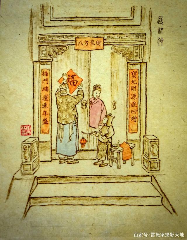 宝庆烙画作品《贴春联 送财神》